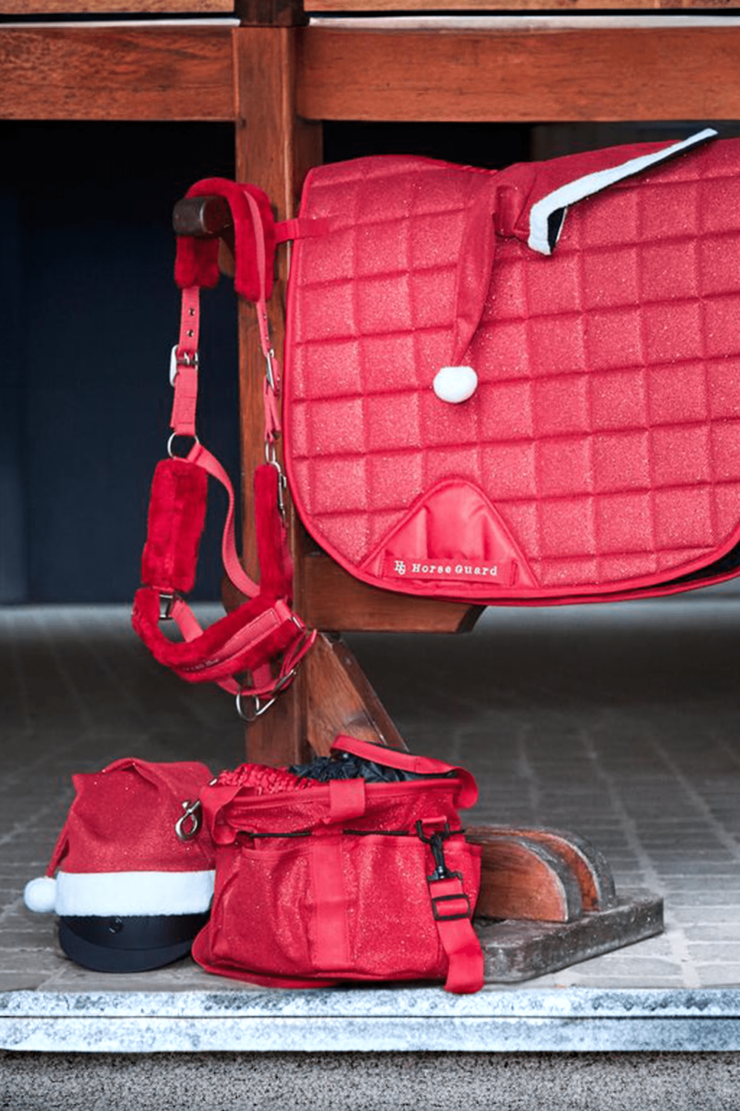 Eine fantastische Mütze für das Pferd mit einem Hauch von Glitzer, da der Meshstoff einen Glitzereffekt hat. Stickerei mit Merry Christmas vorne und ein Rand aus weißem Kunstfell. Öffnungen für die Ohren.