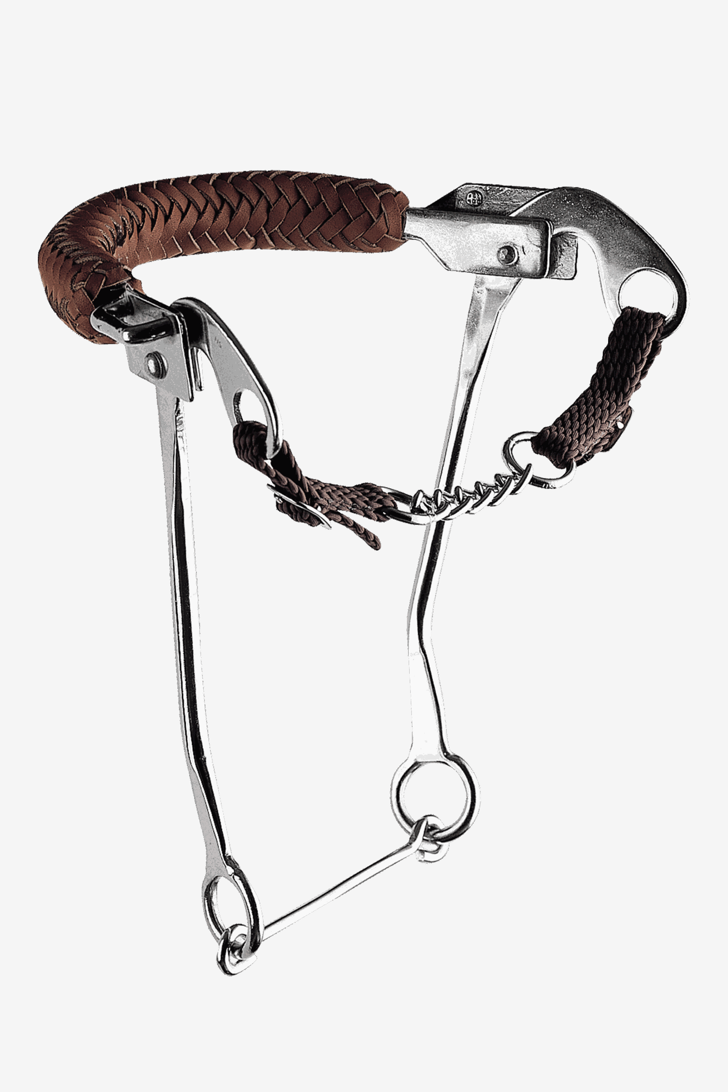 Hackamore von Sprenger mit lederüberzogener Kette über dem Nasenrücken. Sprenger hat ein kombiniertes Hackamore mit langem Schenkel entwickelt, das zusätzlich am unteren Ende zwischen den Schenkeln verbunden ist. Dies bietet dem Reiter mehr Lenkfunktion und ermöglicht das Reiten mit weniger Hilfen.
