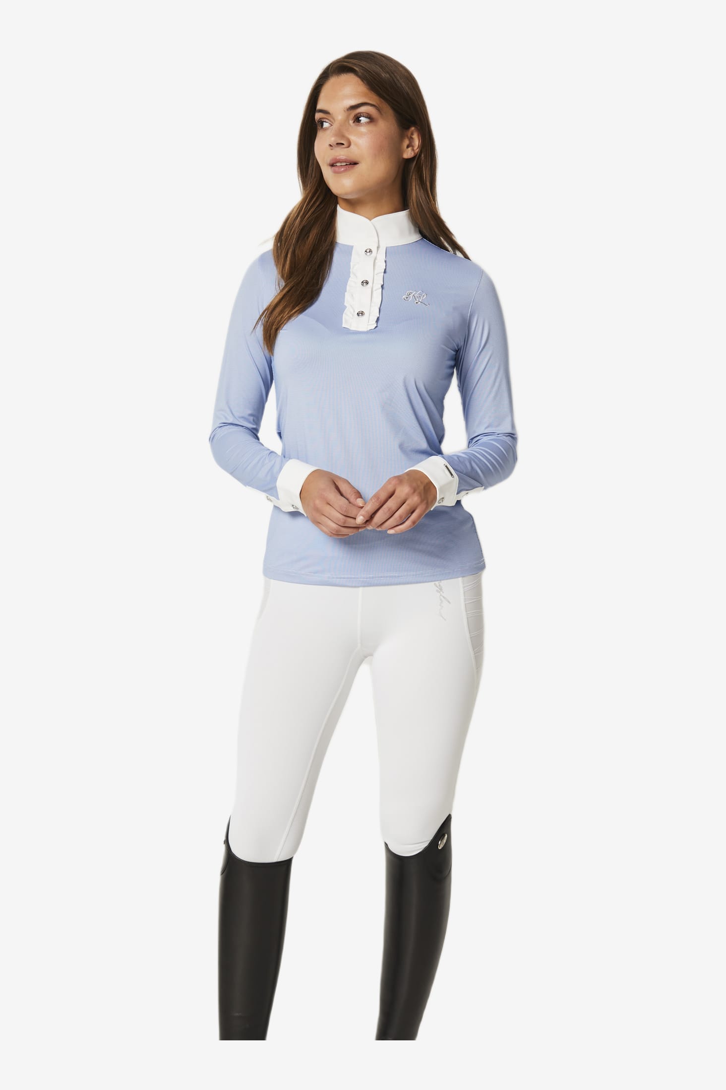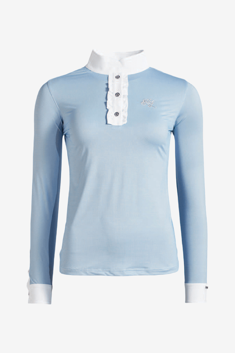 Tävlingskjorta från Kingsland. Långärmad tävlingskjorta för damer. Tillverkad likt en oxfordskjorta i tekniskt material med vit manschett, krage samt knappslå. Detaljer med volanger längs sidorna av knappslån. Kingslands logo med kristaller och broderi på baksidan av krage och på bröstet.