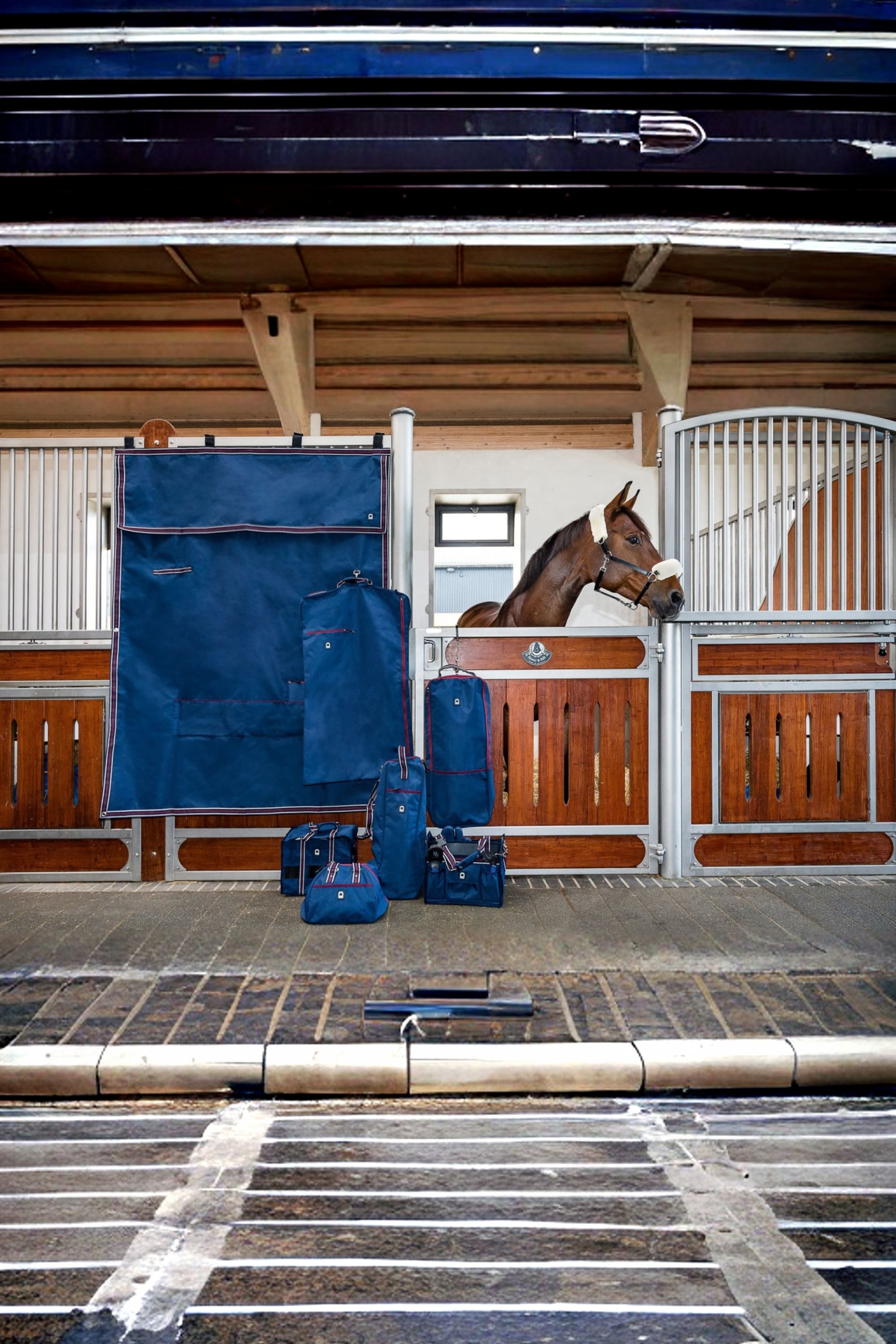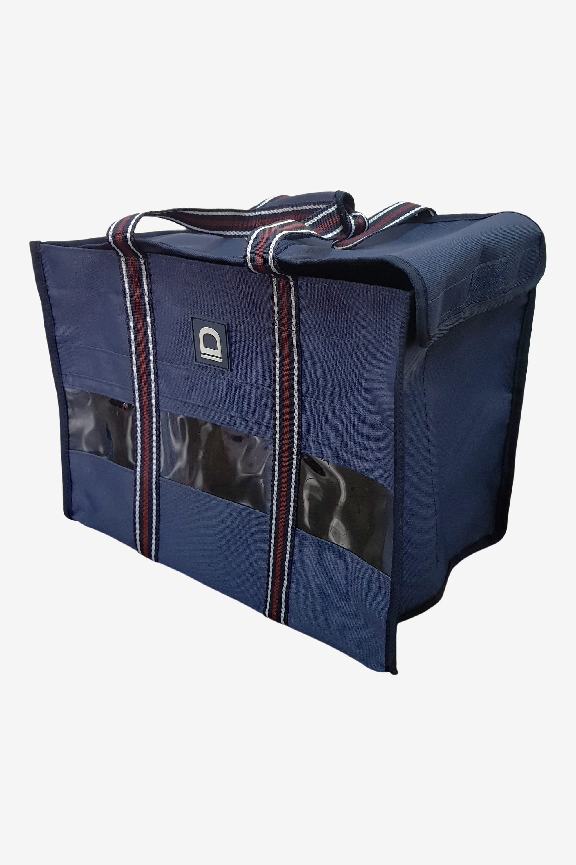 Stilren i marinblå grund med vinröda kantband och diskret logga fram.