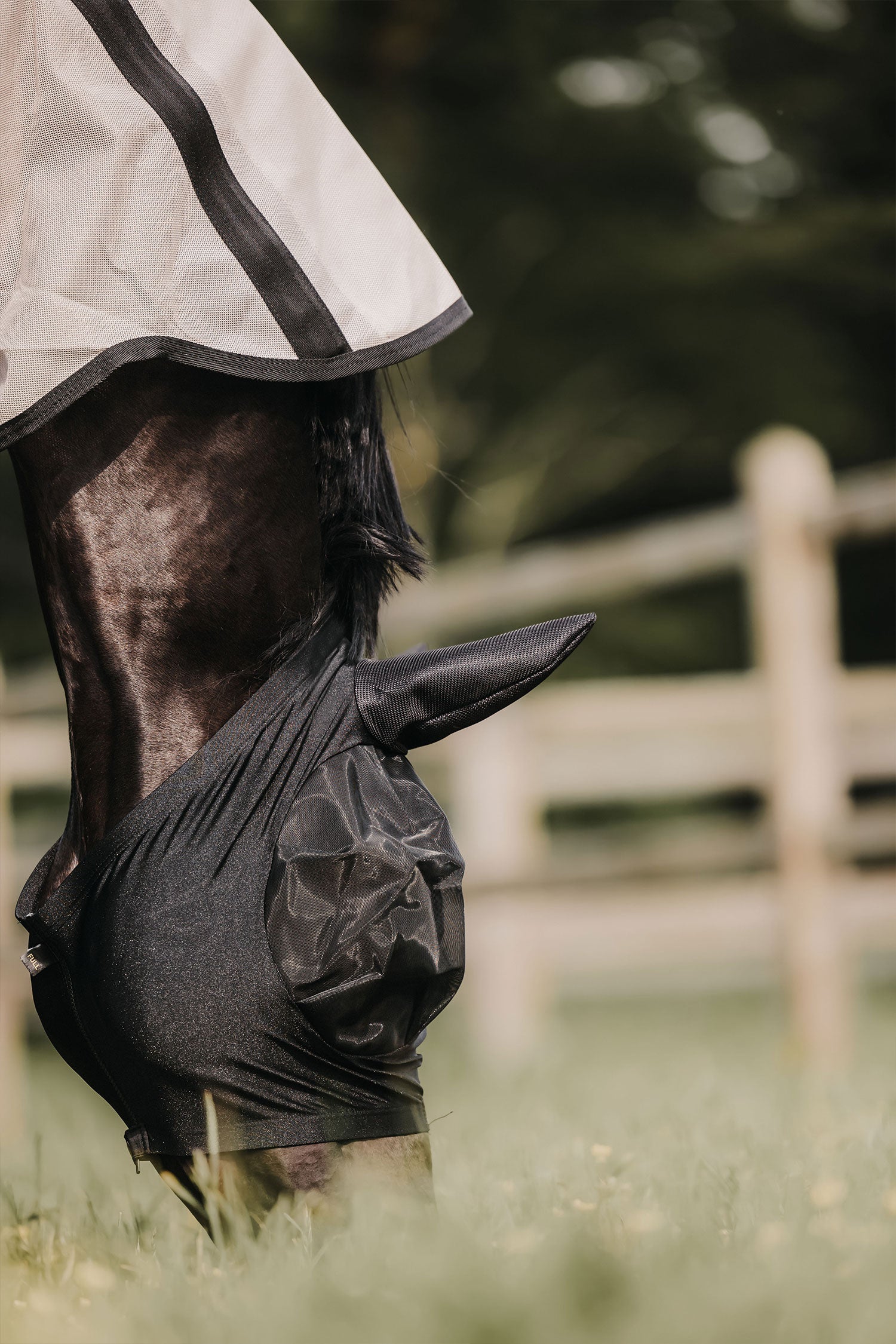 Den berömda Fly Mask Slim Fit är utformad i ett lycra-tyg för perfekt passform samt stor komfort och extra bra skydd för hästen.