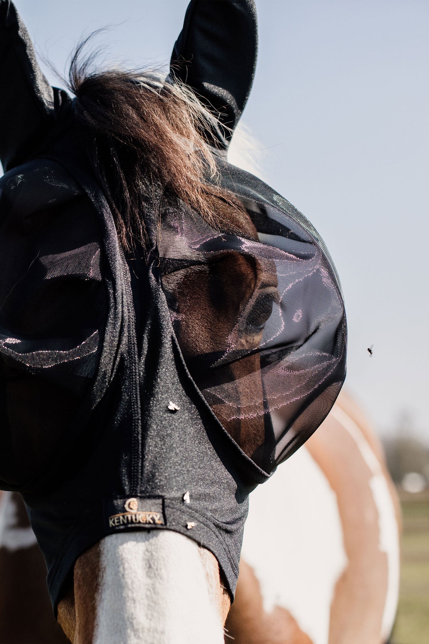 Fly Mask Slim Fit från Kentucky blir som en andra hud med dess slimmade passform och förhindrar insekter att flyga in. De extra vida och utsydda ögonen förhindrar irritation hos hästens eftersom det inte rör hästarnas ögon.