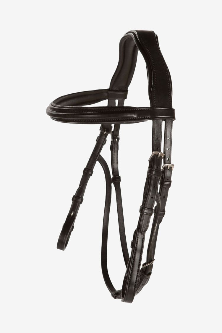 Anatomiskt mjukt fodrat nackstycke inklusive fodrat pannband, med käkrem och en extra rem framför för att hålla sidostyckena på plats. Anpassat för användning av hackamore.