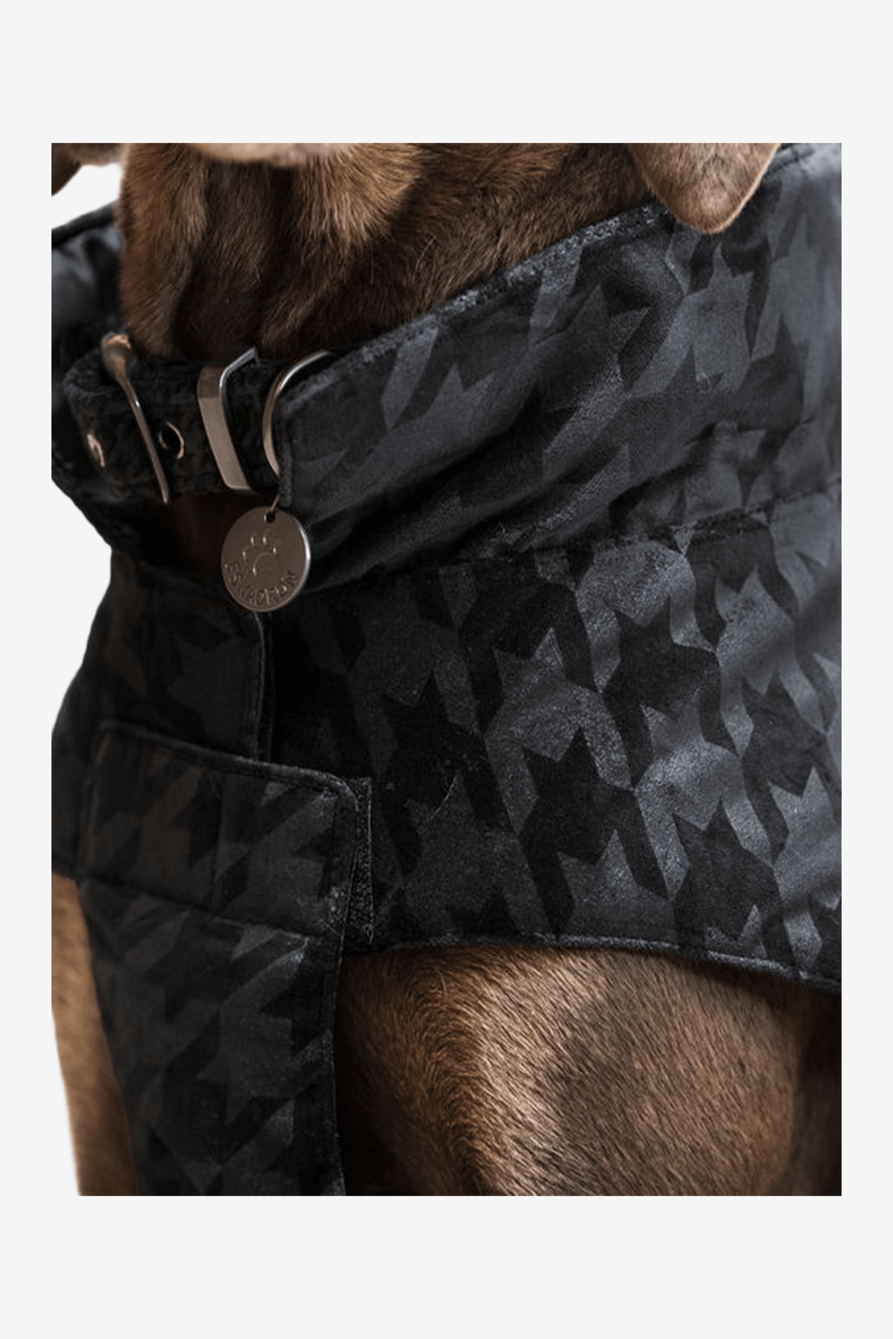 Täcket knäpps snyggt med bröst och mage. Smart försedd med ett utgångshål för koppel.