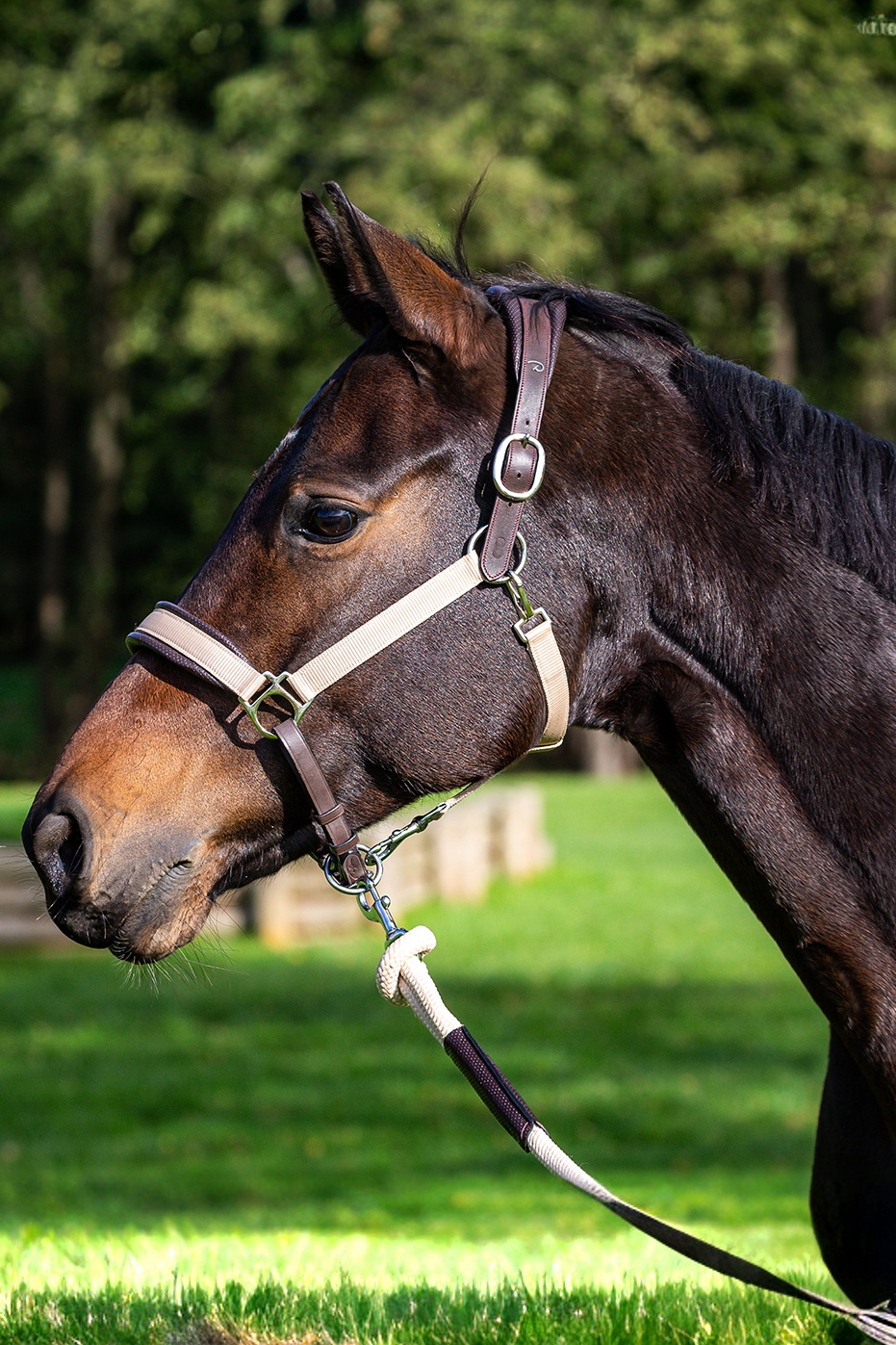 En suppersnygg nylon grimma med detaljer i brunt buffalo läder och mjuk vaddering för extra komfort. Smart 2-1 lösning som gör att har en perfekt fingrimma som du enkelt kan göra om till en grooming-grimma.