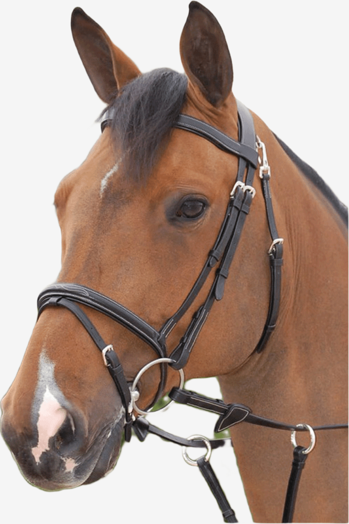 Träns kombinerad nosgrimma från Dyón – Working Collection. Tillverkat av vattenbuffelläder med vit mönstersöm och snabbspänne på käkremmen. Snygga graverade S/S spännen. Silverspännen.