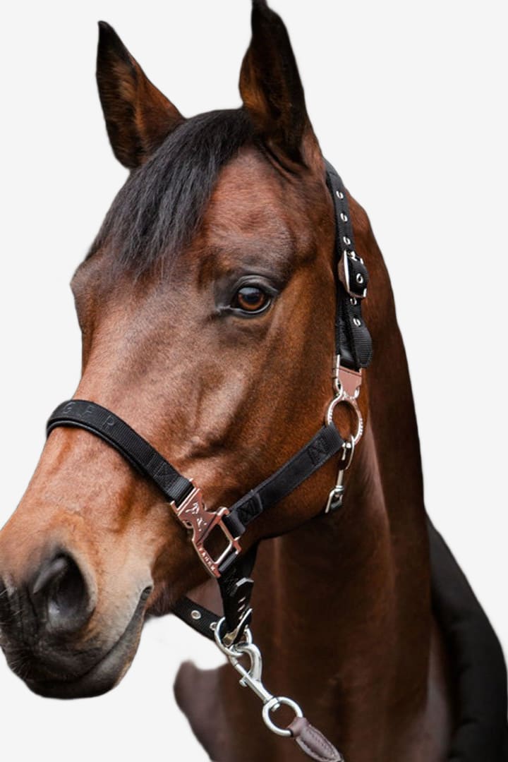 När du öppnar säkerhetsknäppet på nosdelen kommer grimman fortfarande vara runt hästens nacke, detta gör det enklare samt säkrare när du tränsar hästen.
