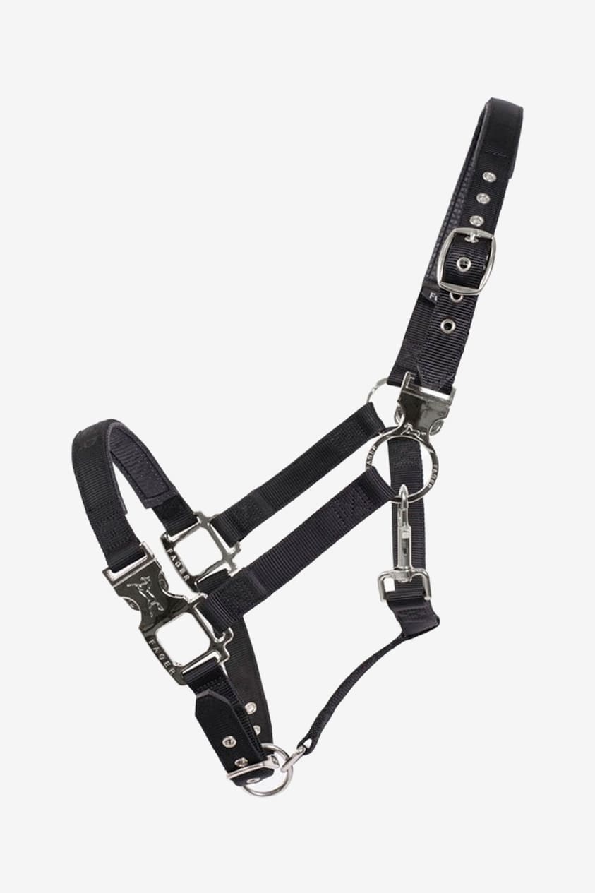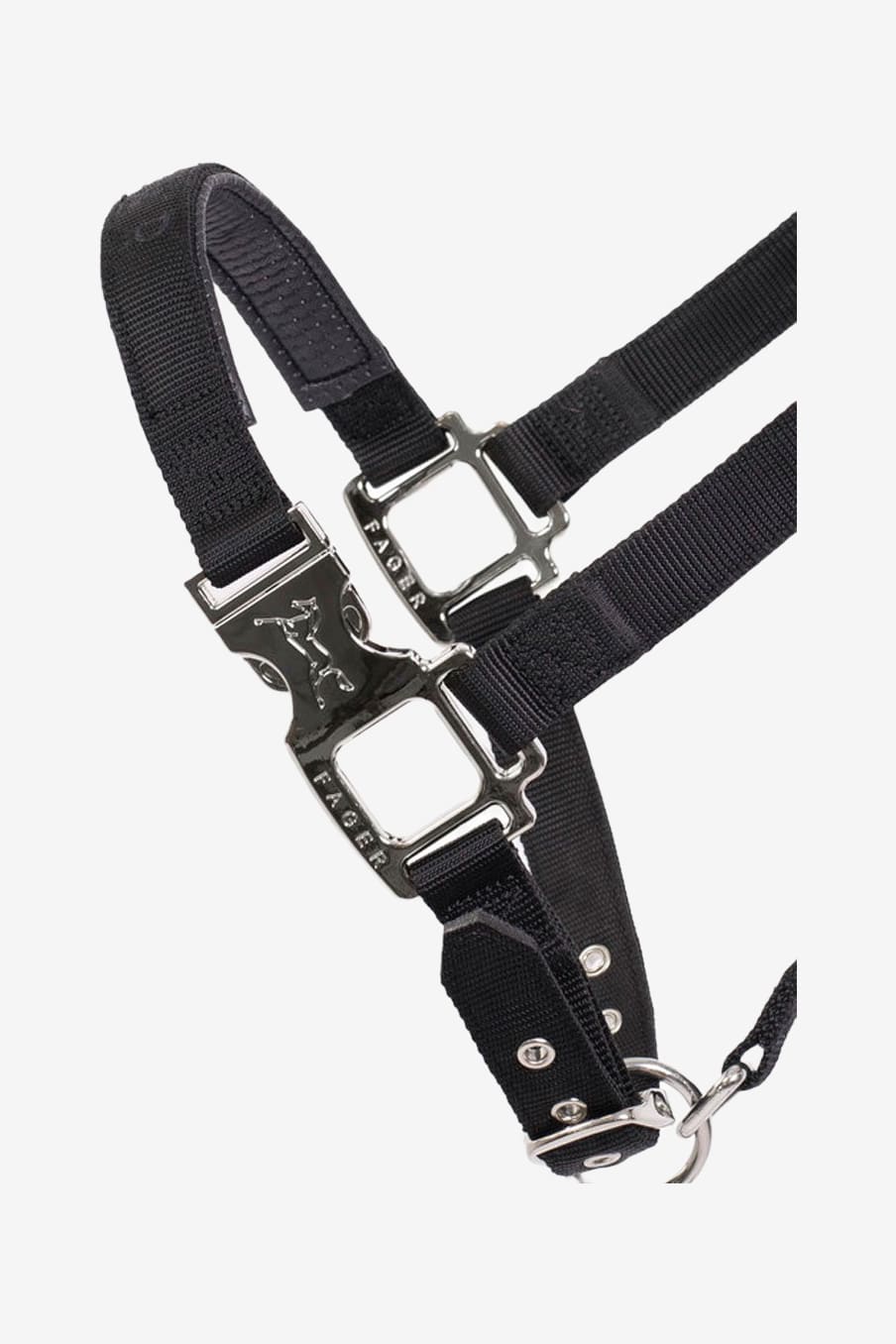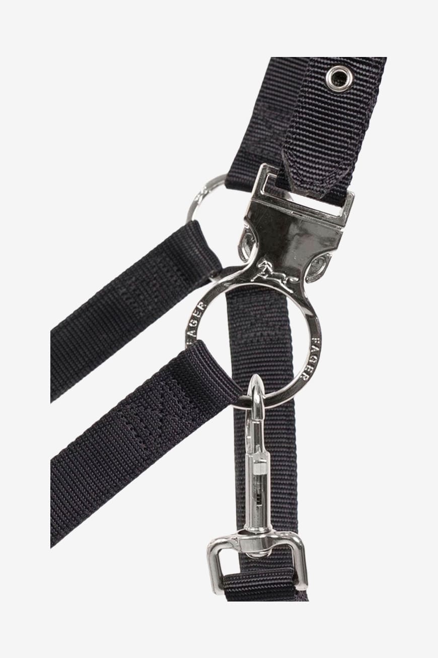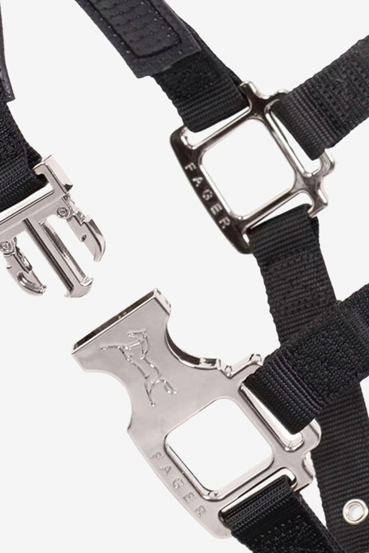 Grimman är reglerbar runt nacke och under nosen. Graverad Fager logga på spännena samt Fager brodyr över nosedelen.