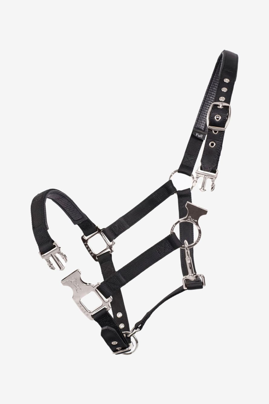 Säkerhetsknäppet i nacken gör grimman enkel att få av hästen genom att öppna knäppet om hästen exempelvis skulle fastna och behöver komma loss snabbt. Det kan även hjälpa när du ska sätta på grimman på en unghäst eller en känslig häst som inte vill att grimman ska gå över öronen.