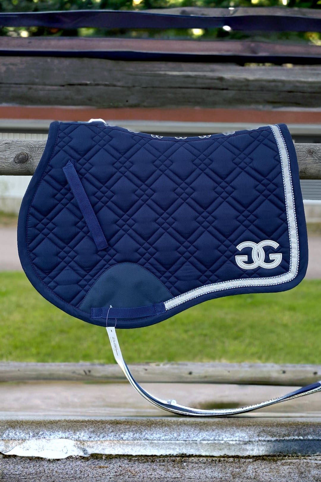 Snyggt och elegant schabrak med glittrig tråd insydd i tyg som skimrar lätt. Två passpoaler och kantband längs med kanten, en i silver och en med kristaller. GG-logga på vänster sida i blankt tyg.