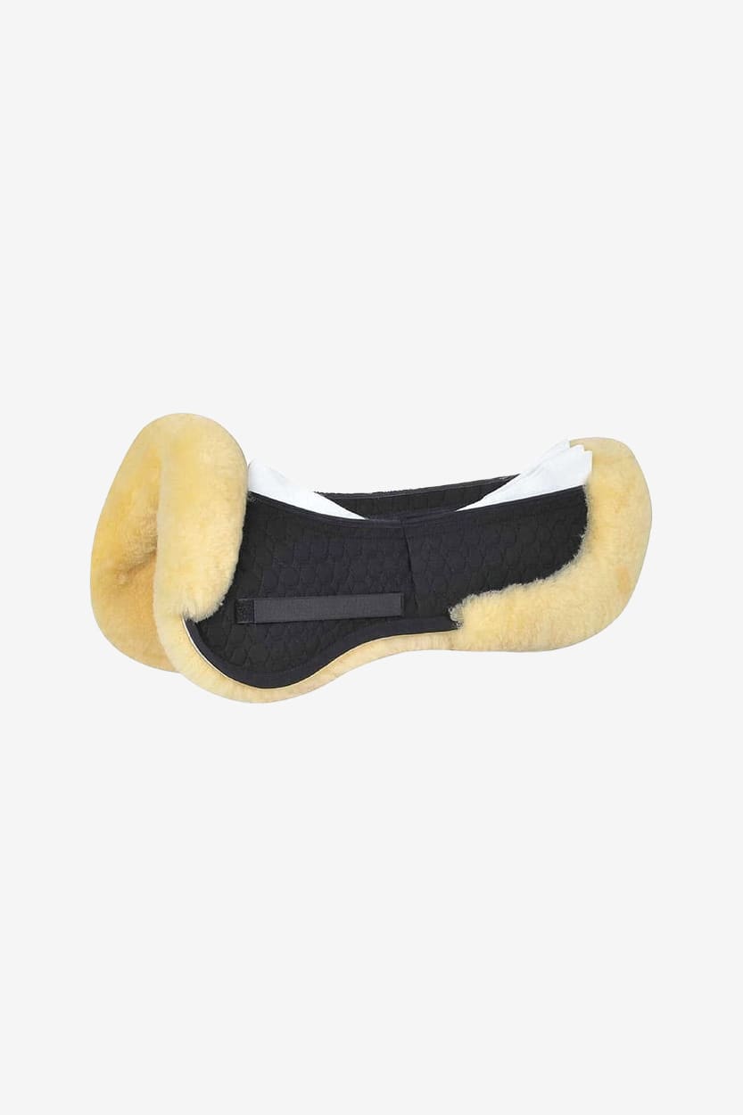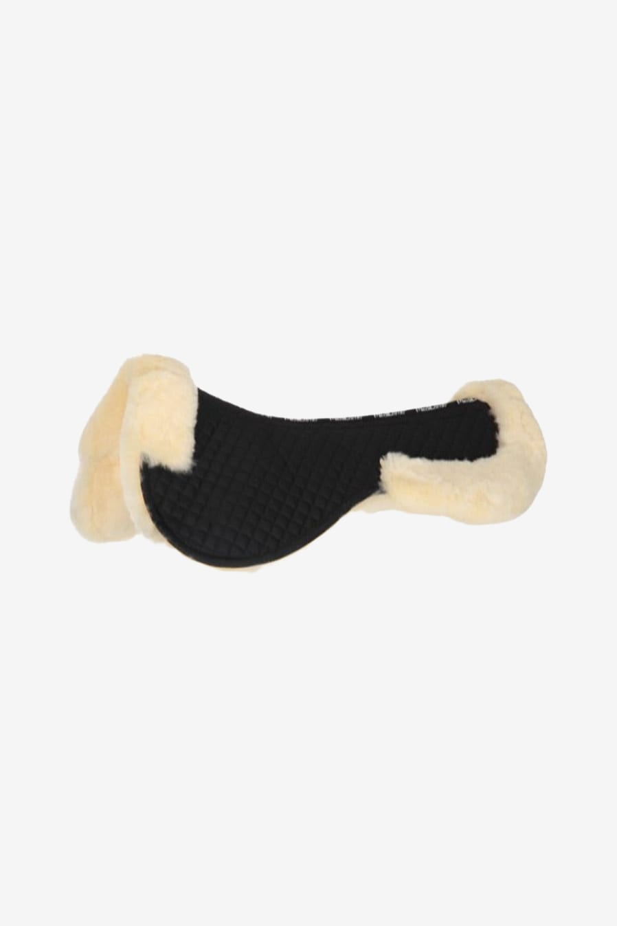 Korrektionspad med svart quiltad ovansida. Naturfärgat fårskinn med kanal för att frigöra ryggraden. Fårskinnet verkar stötdämpande mot hästens rygg och höjer sadeln lite.