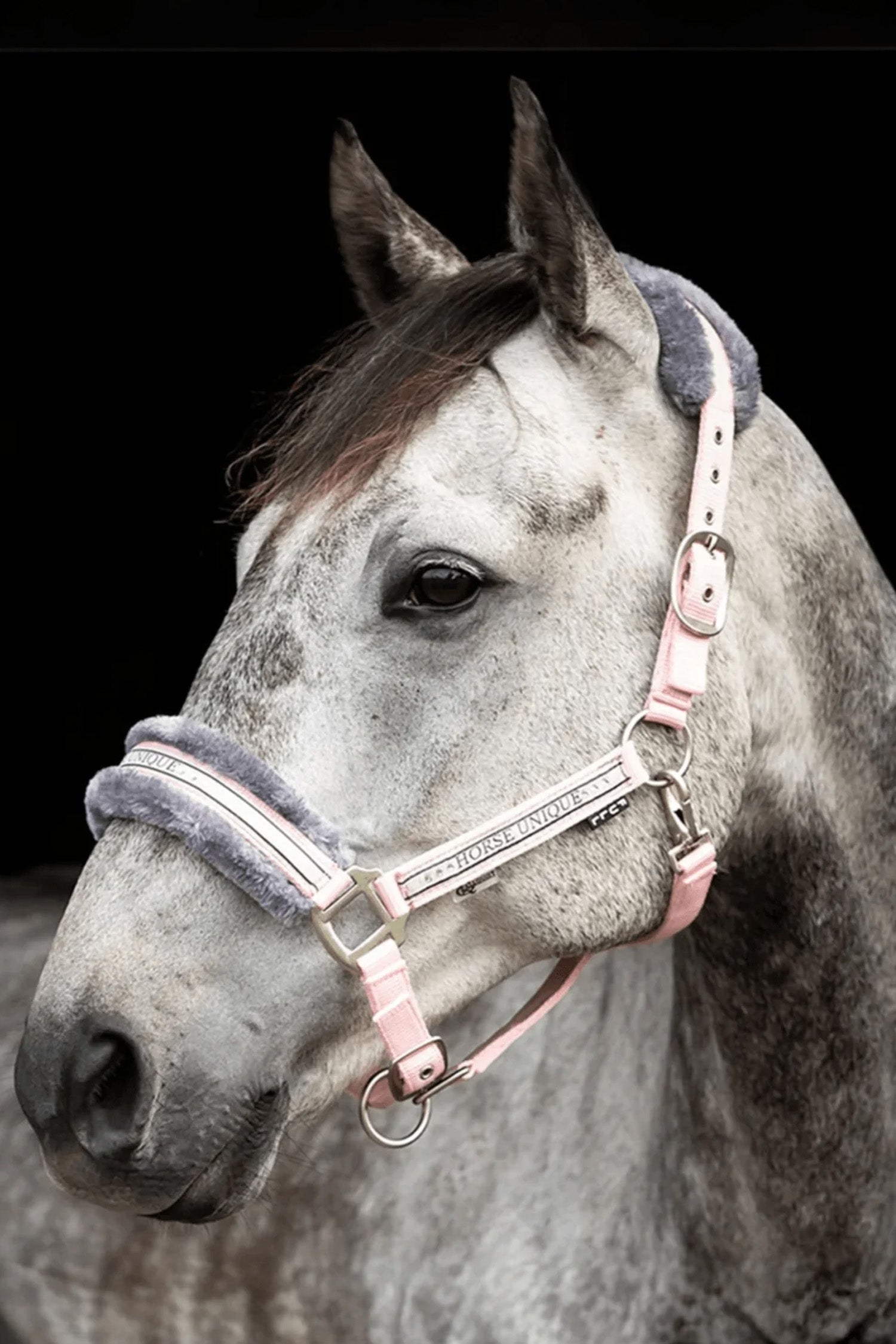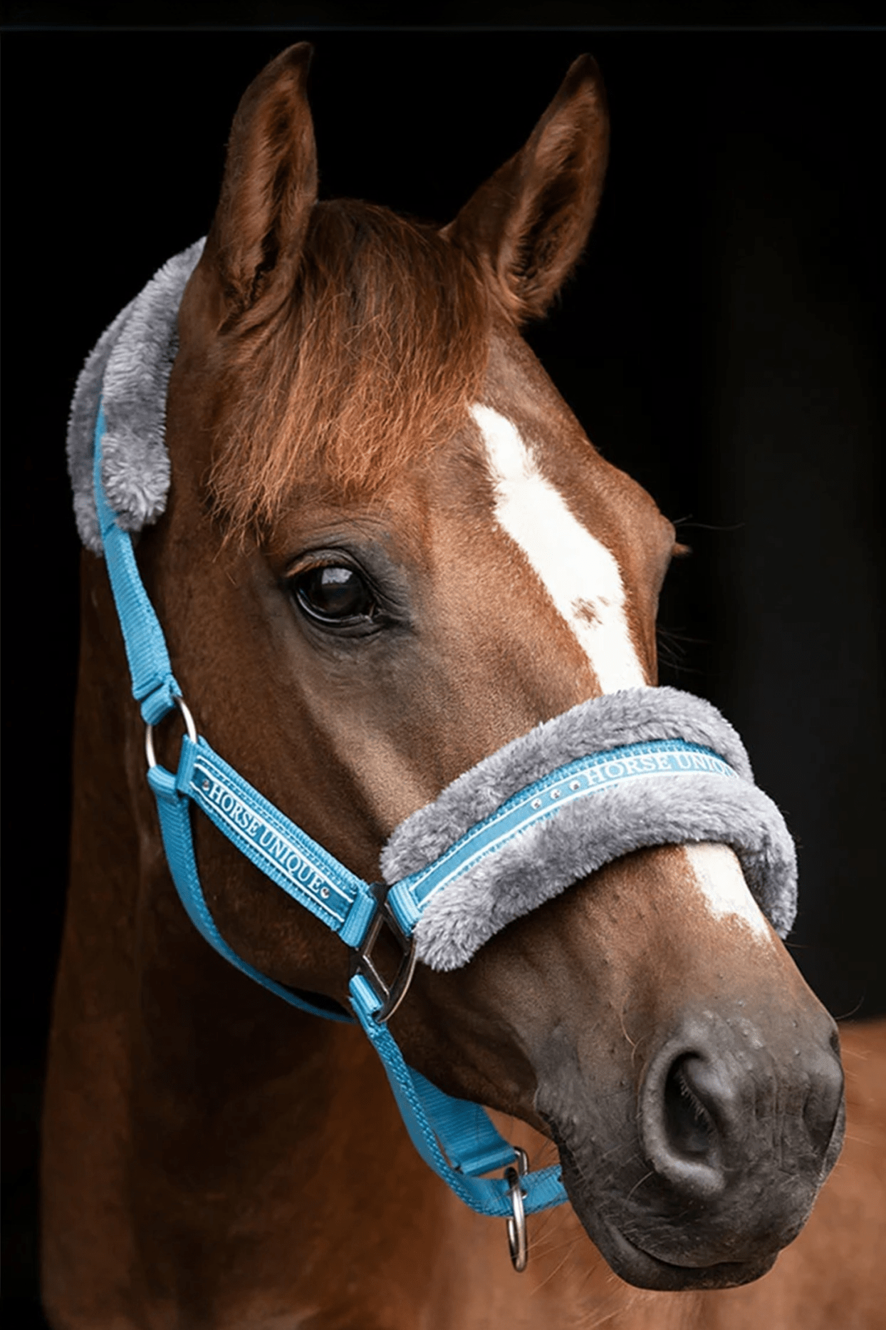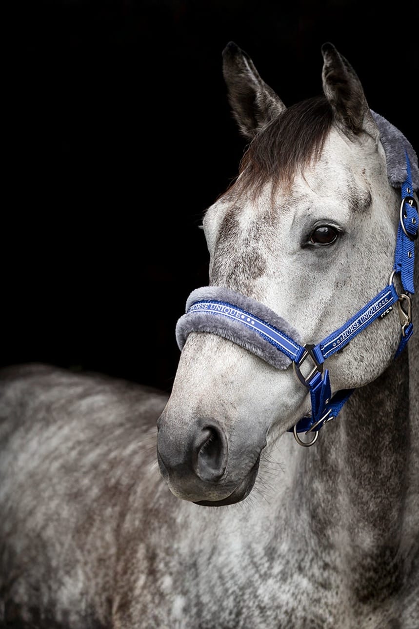 Grimma i läcker färg med mjuk päls vid nos och nacke som förhindrar skav. Stenar på sidorna och nosen. Storleken går enkelt att justera vid nack- och nosrem med spännen i matt silver.